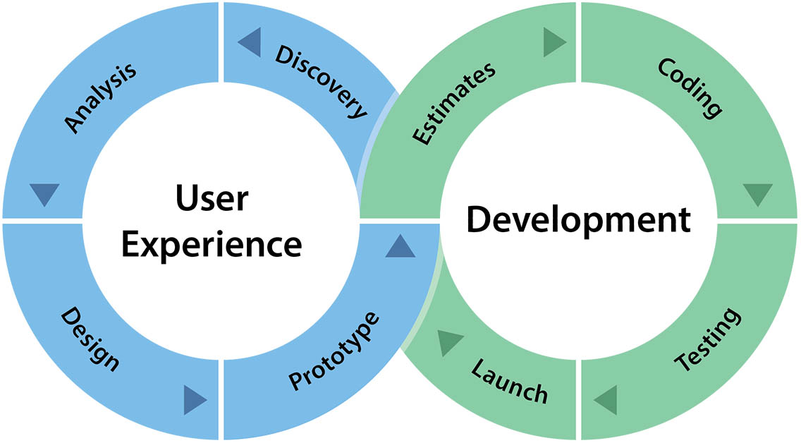From here the UX team will eventually have access to a lot of data through metrics, support feedback, and user testing/feedback. The UX team can then begin the process all over again, proposing new enhancements, which are then scheduled into the product roap map along with bug fixes to create a steady cycle of improvements.